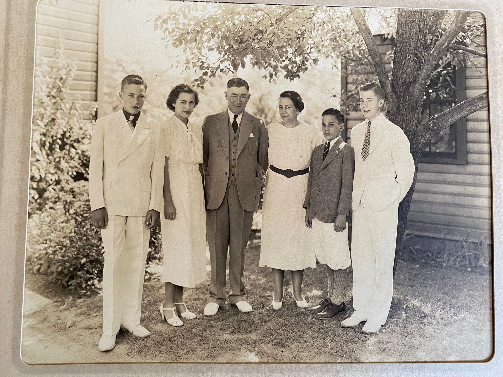 “This photo of the Koch family was taken in the 1930s at their house in Dunkirk, N.Y., where they lived near a downtown park. The parents, William and Loretto Koch, are the older couple in the middle of the picture. Frederick is the young man in knickers second from right, and on the far right is older brother William Koch Jr., who also died in 1943 in an airplane crash. Frederick Koch's sister Peggy, second from the left, was the first family member able to make it to Frederick Koch's hospital bedside in Winston-Salem after Koch was injured in a car crash on June 12, 1943. She was also the mother of Tom Mead, interviewed for this story. On the left is John Koch, another of Frederick Koch's brothers.” Wes Young