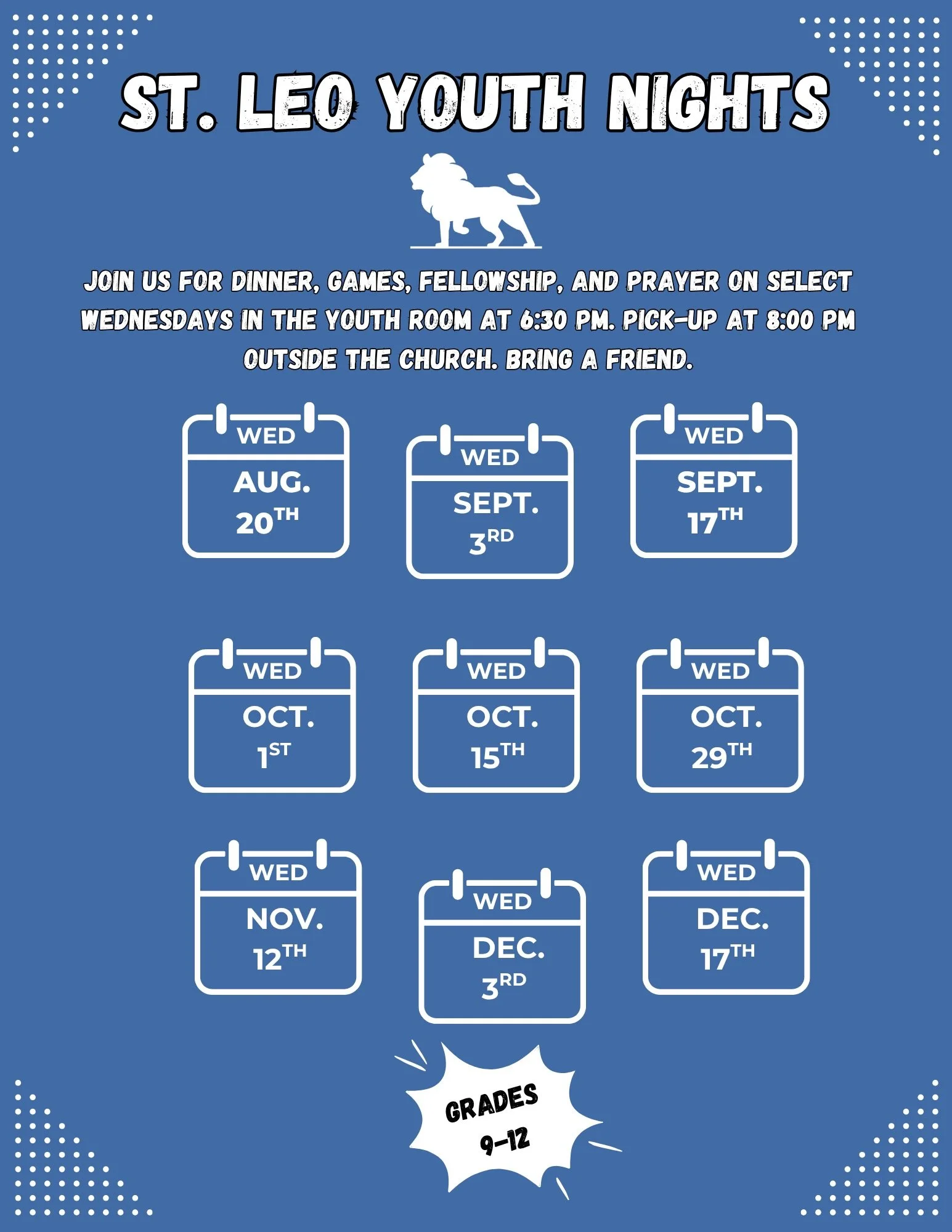 St. Leo Youth Ministry is having a great year filled with faith, friendships and fun! Please keep an eye here, in the bulletin & on social media for information about program plans for the year ahead. Adults interested in volunteering and assisting with high school and middle school youth ministry are encouraged to email Colton Brown.